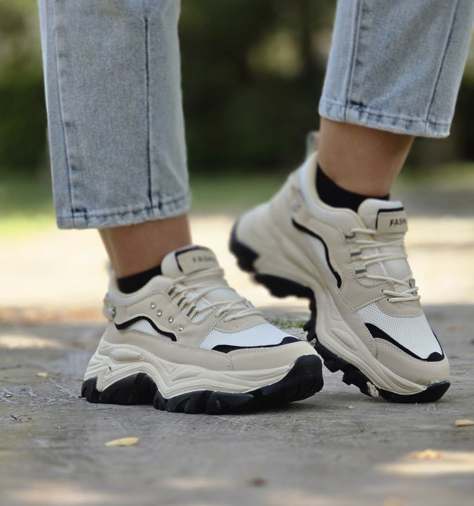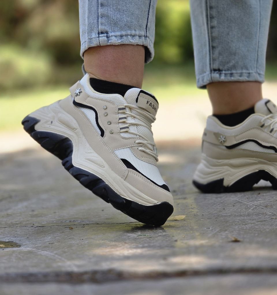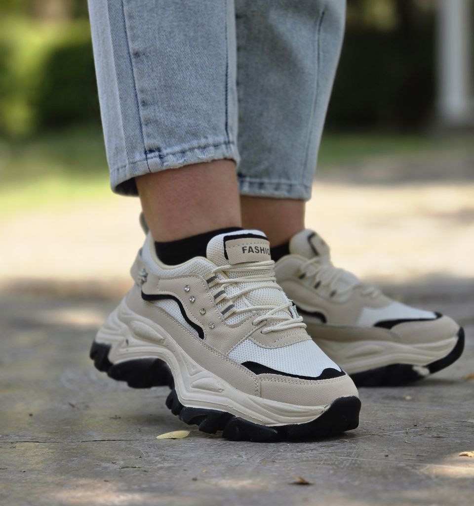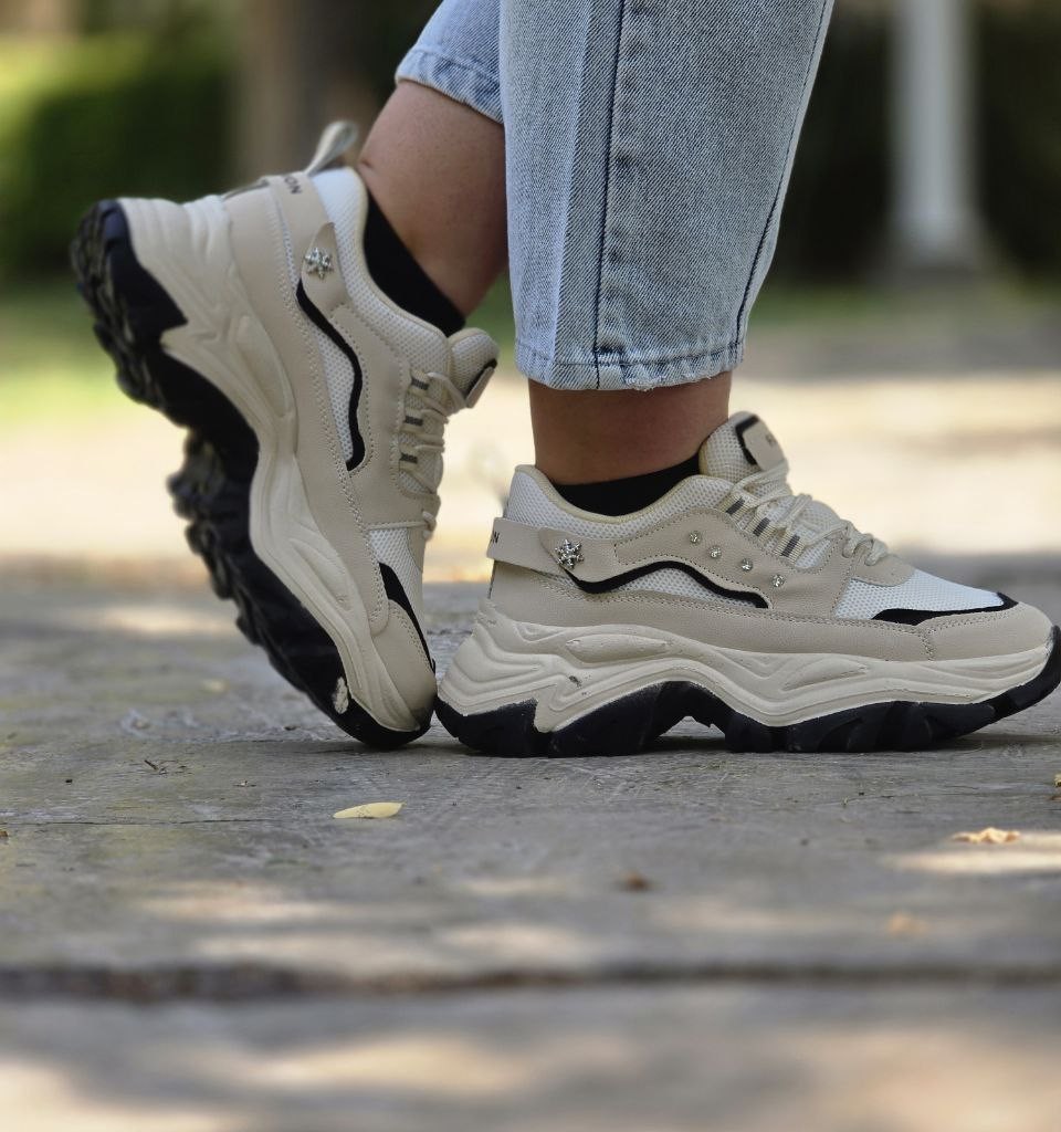 فروش عااالی کفش اسپرت زنانه دخترانه فشیون مدل نگینی بادوام و مقاوم رنگ کرم زیره مشکی باارسال رایگان