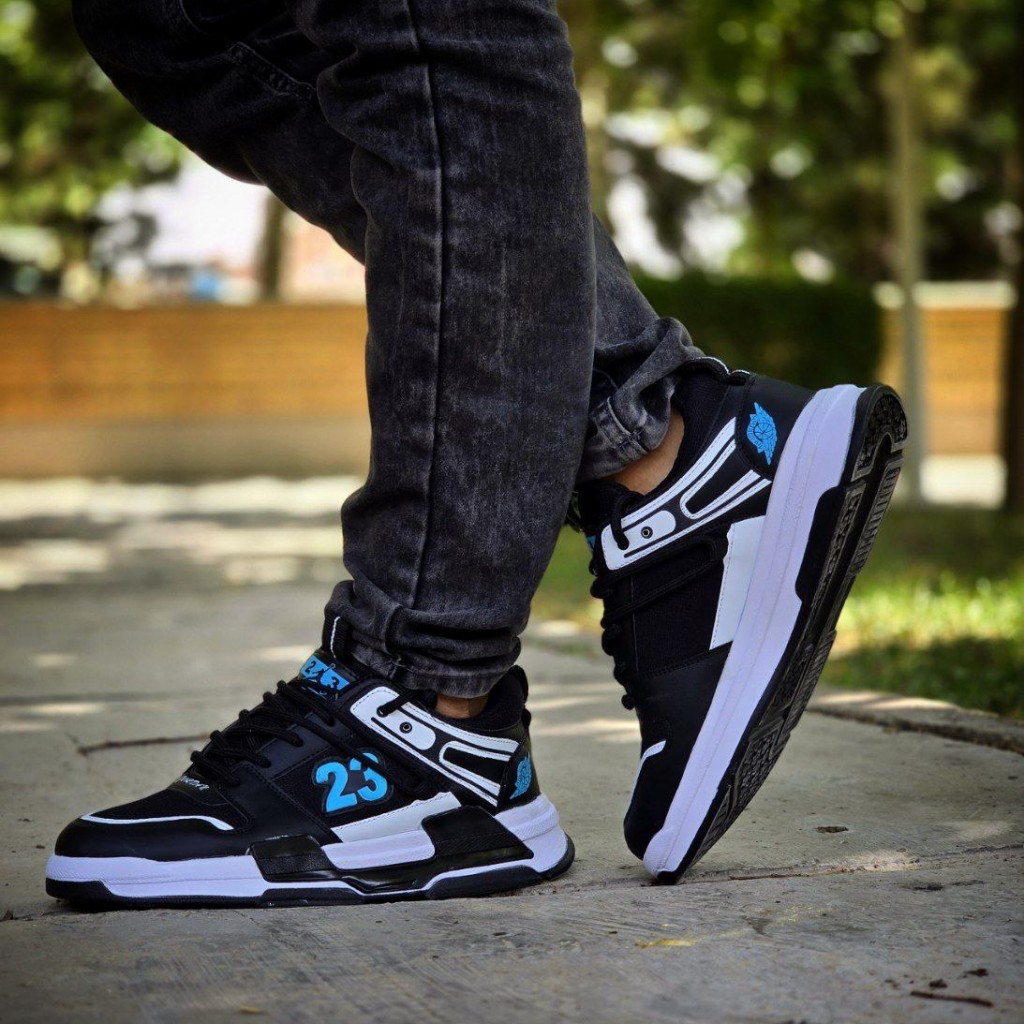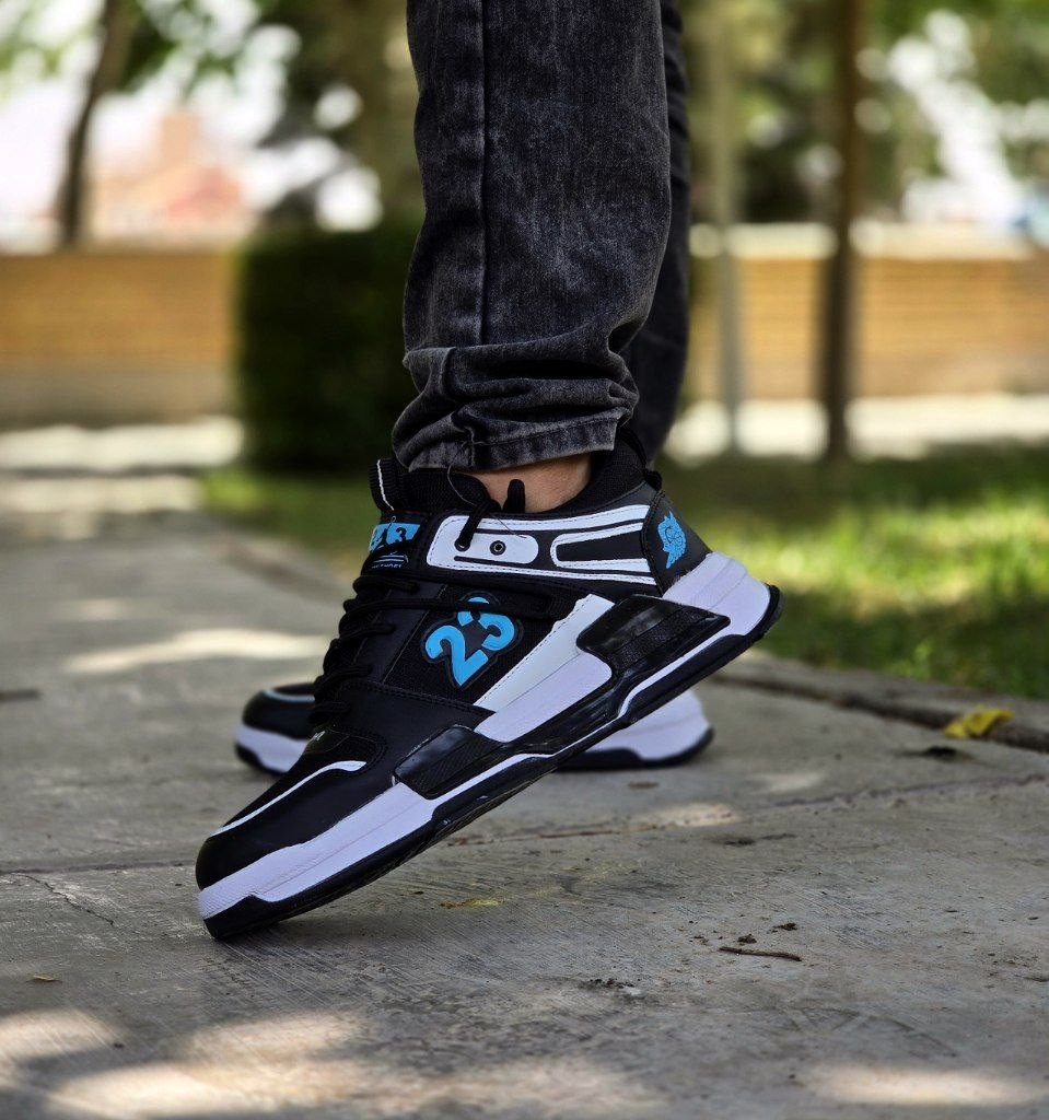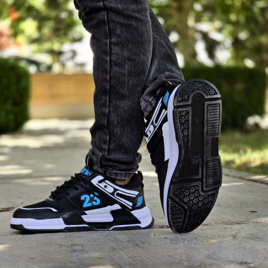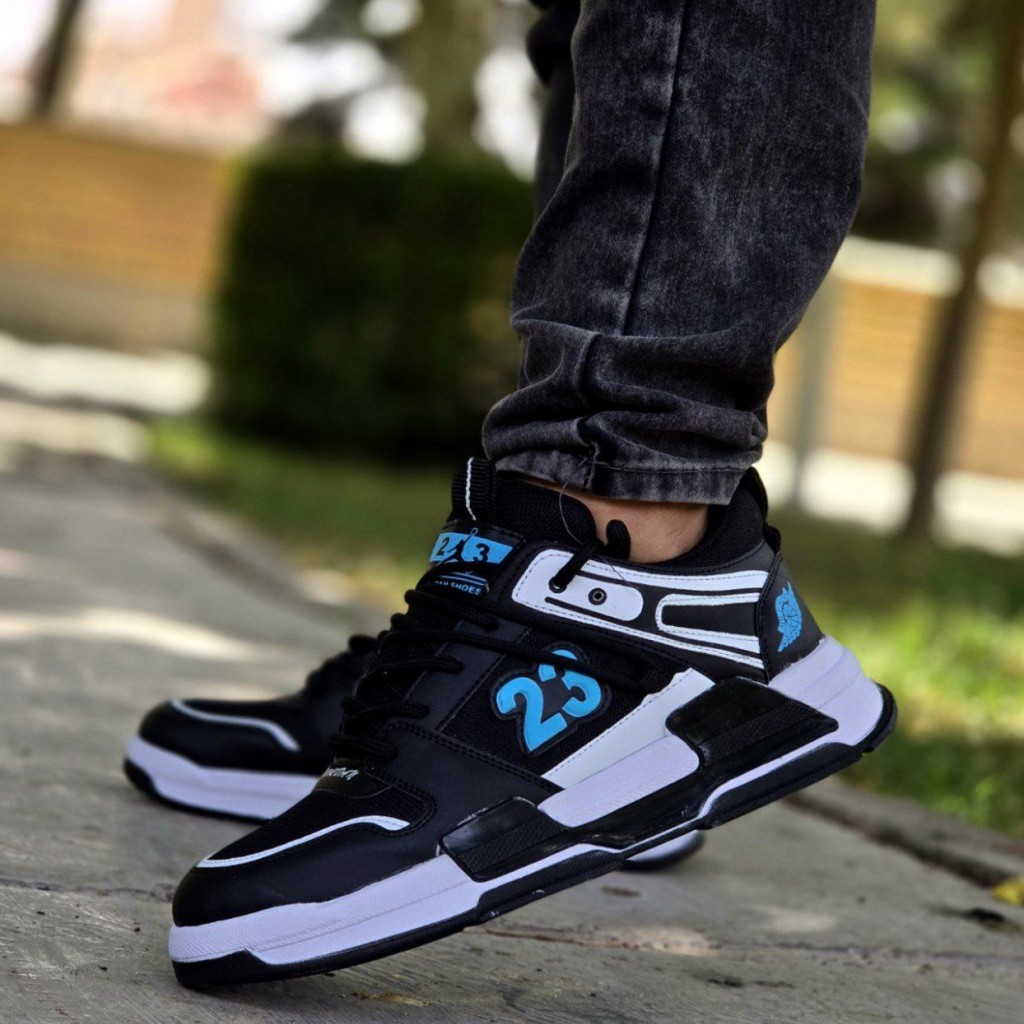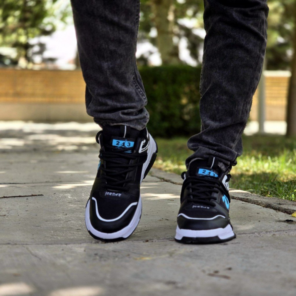 تخفیف ویژه کفش اسپرت مردانه پسرانه مدل جردن 23 رنگ مشکی آبی زیره سفید زیبا و خاص با ارسال رایگان
